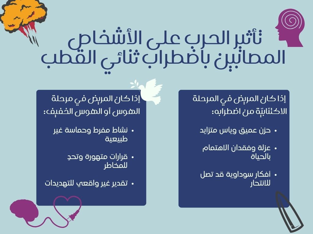 هذه التغيرات المزاجية المتقلبة تضع المصابين باضطراب ثنائي القطب في دائرة من التحديات المضاعفة خلال أوقات الأزمات والحروب، حيث لا تكفي الظروف الصعبة وحدها لتقويض استقرارهم النفسي، بل يتضافر اضطرابهم المزاجي مع الظروف الخارجية ليصنع معركة يومية مستمرة من أجل البقاء والتوازن النفسي
